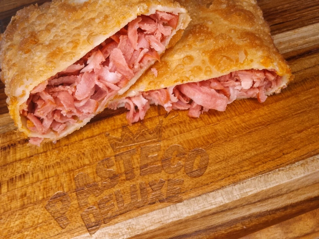 Pastel de queijo com calabresa. Recheio padronizado em 150 gramas. Para mais, opte por adicionais.